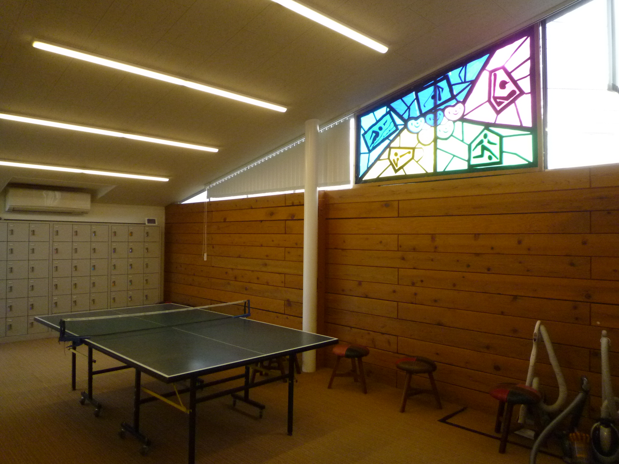 卓球ルームの窓に展示されています。