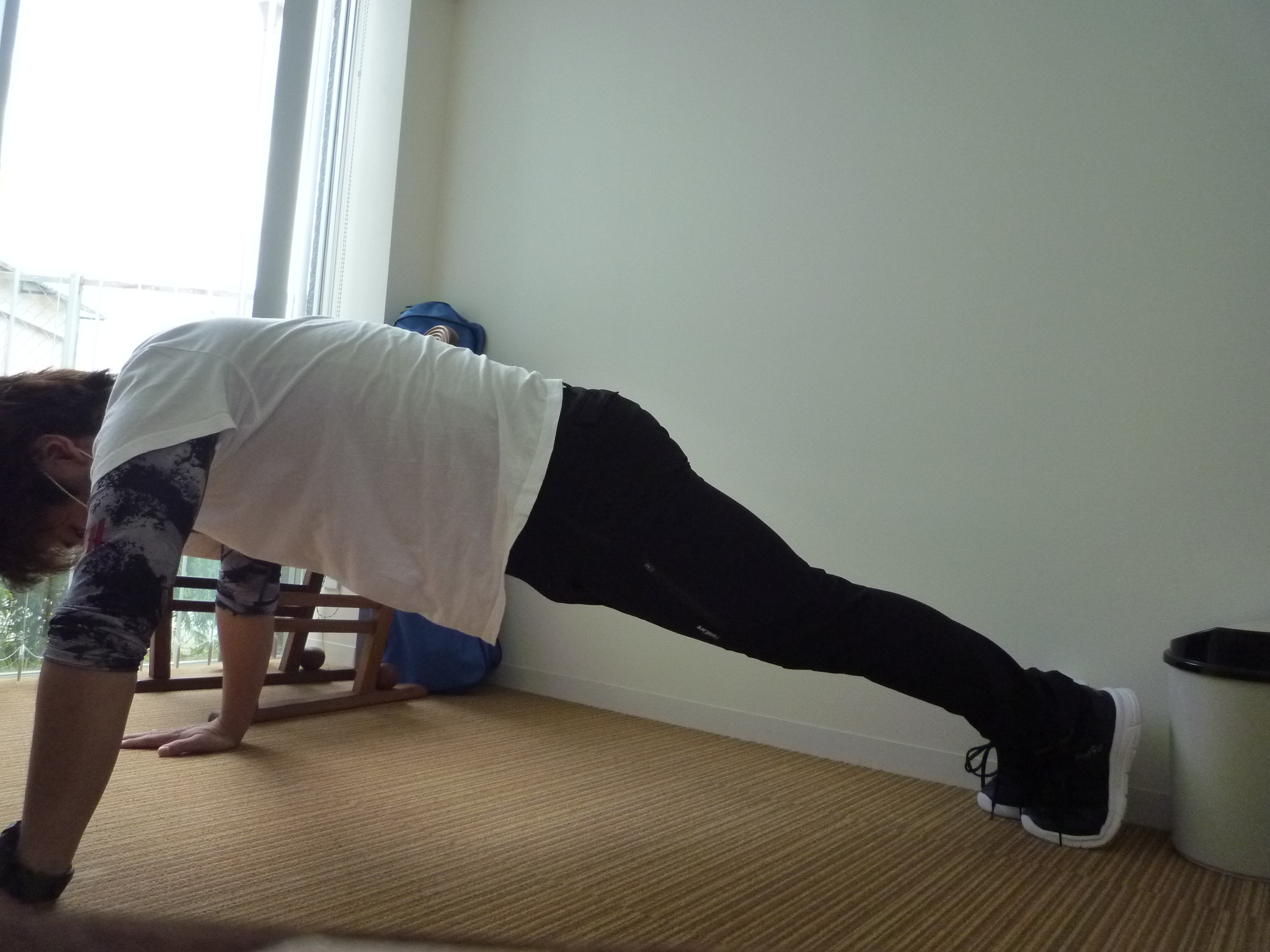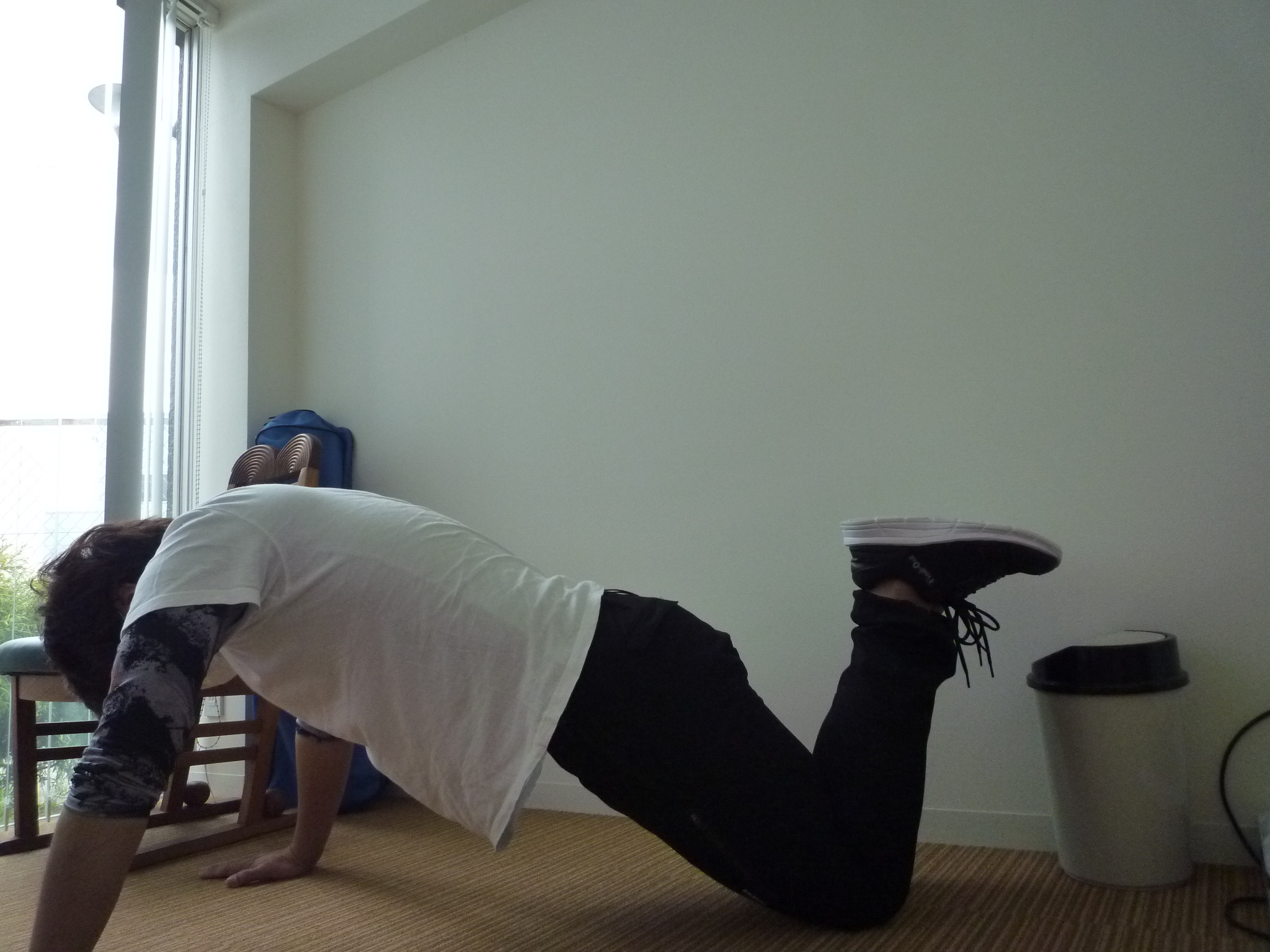 腕立てはつま先で支えるところを、膝でささえるようにすると負荷が減ります